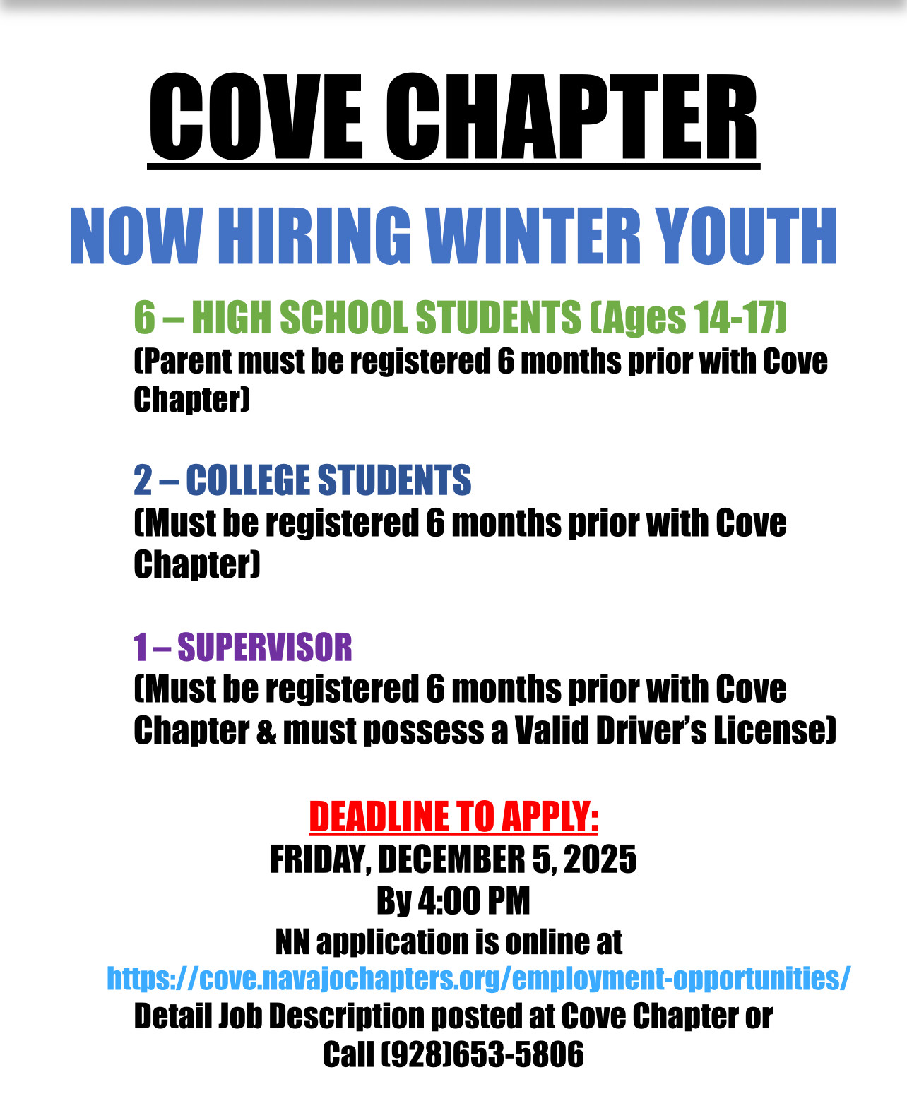 Our community enjoys a rich fabric of valley and woodland areas, interwoven with environmental resources, grazing, open space and the vast mountains, all representing a heritage of natural beauty. Our Chapter house serves and ties together the entire community. The Cove Chapter conducts meetings monthly to keep residents informed; residents have a forum to express their opinions to their Navajo Nation Council Delegate or to decide on matters concerning their Chapter.